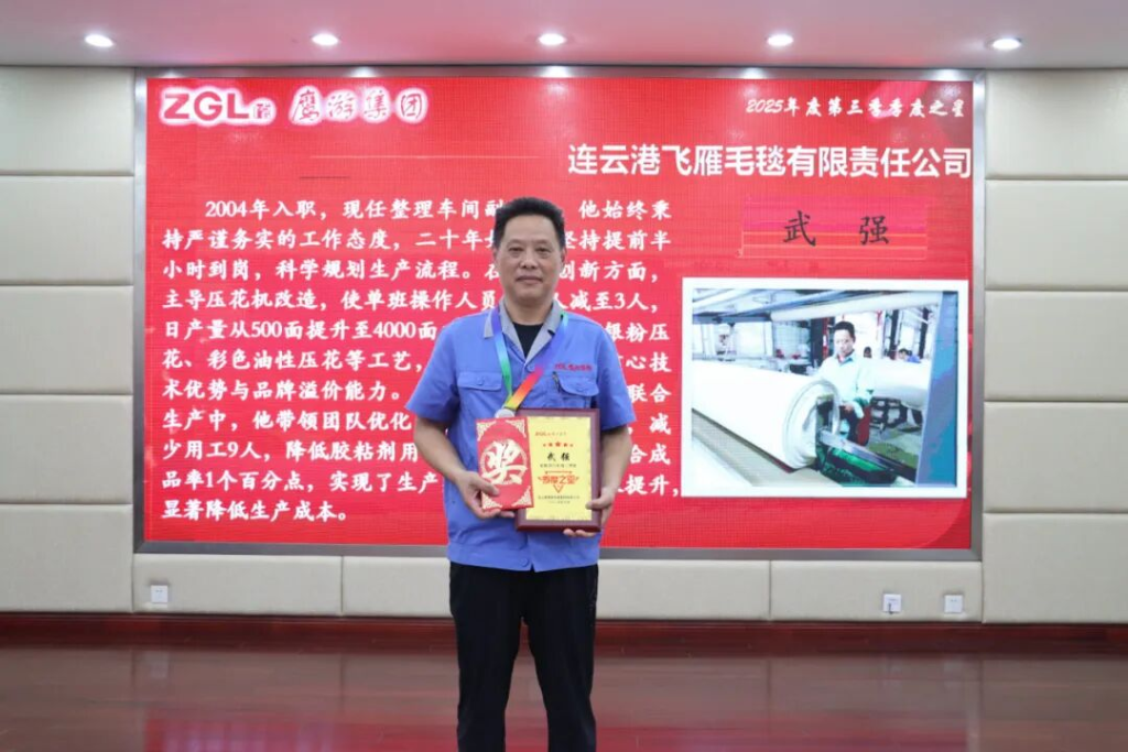 武強,自2004年加入飛雁毛毯公司以來,從基層新產品抬板壓花工逐步成長為整理車間副主任。他始終秉持嚴謹務實的工作態度,二十年如一日堅持提前半小時到崗,科學規劃生產流程。在技術創新方面,主導機器改造和工藝改革,有效提升了企業核心技術優勢與品牌溢價能力,實現了生產效率與產品質量雙提升,顯著降低生產成本。為此榮獲先進工作者、技術管理創新之星、科學技術進步獎等多項榮譽。